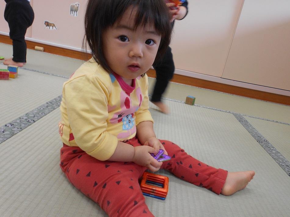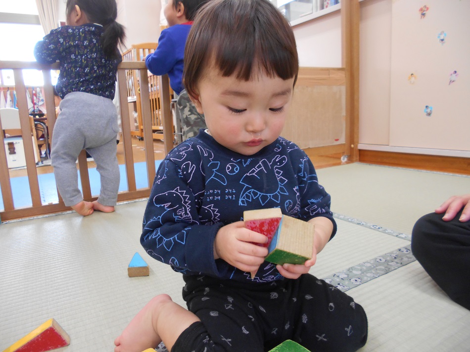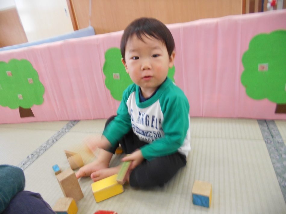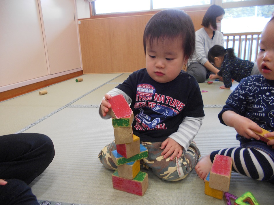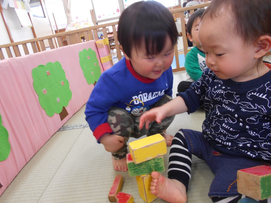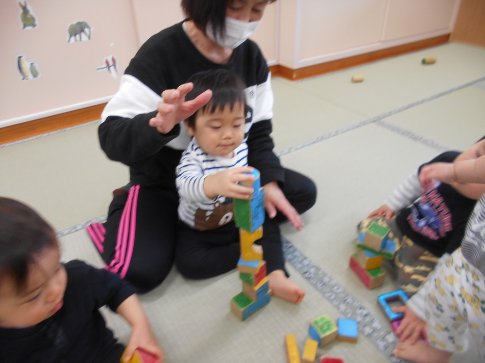保育者と一緒に難しい形の積み木も上手に積めました!!