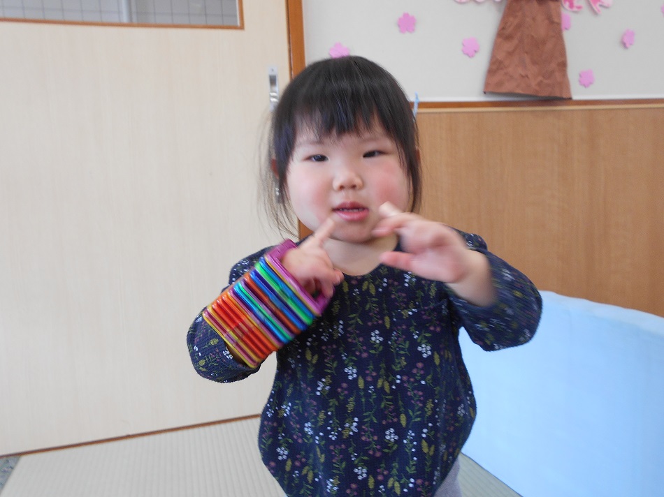 たくさんくっつけてブレスレットにするお友だちもいました!「かわいいでしょ?」