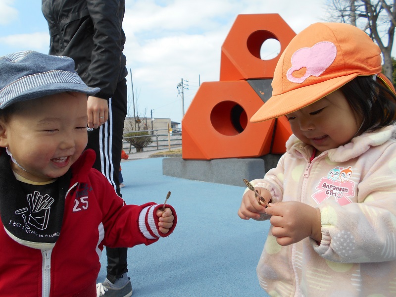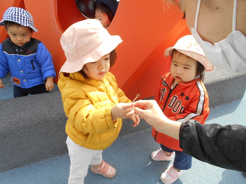 つくしが生えているのを見つけ、子どもたちに見せると珍しそうに手を伸ばしていました✨