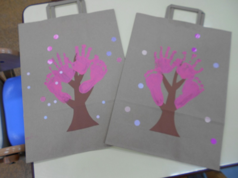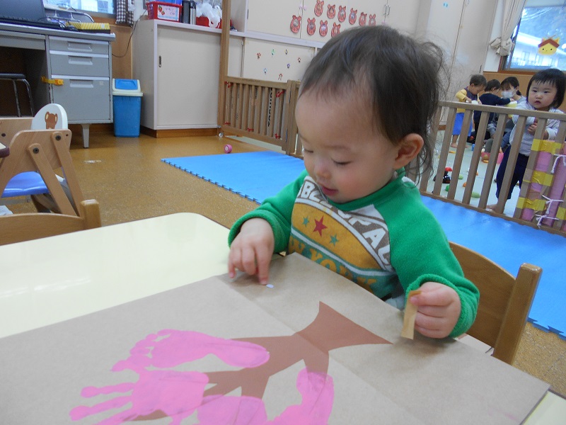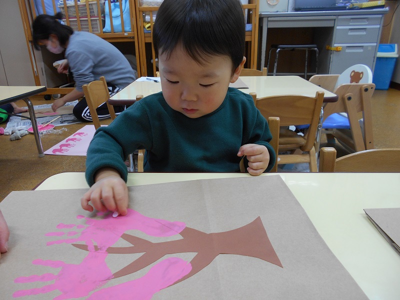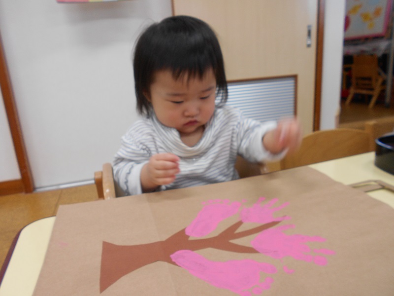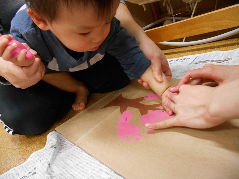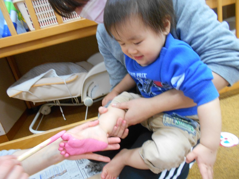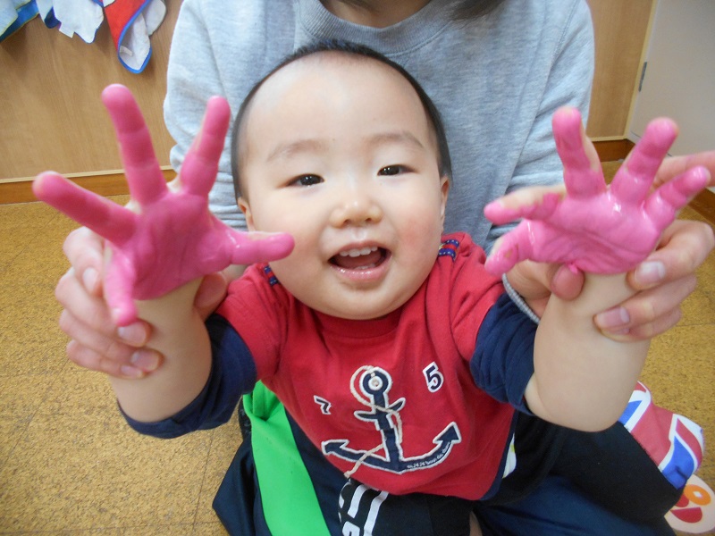 今日はその集大成!両手・両足に絵の具をつけて、ペッタンと形を取りました。