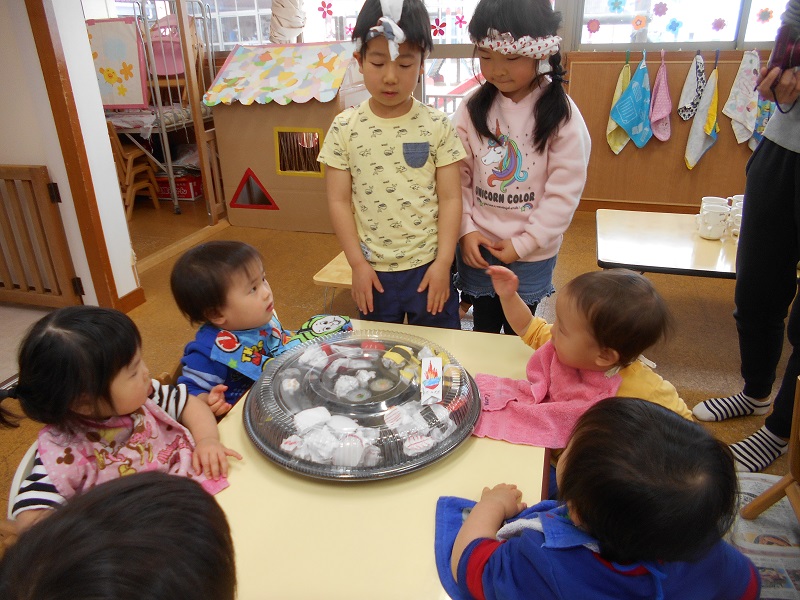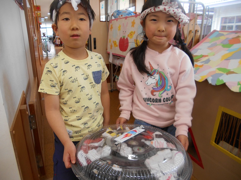 ろけっと組のお寿司屋さんがいちご組まで出前を持ってきてくれました✨