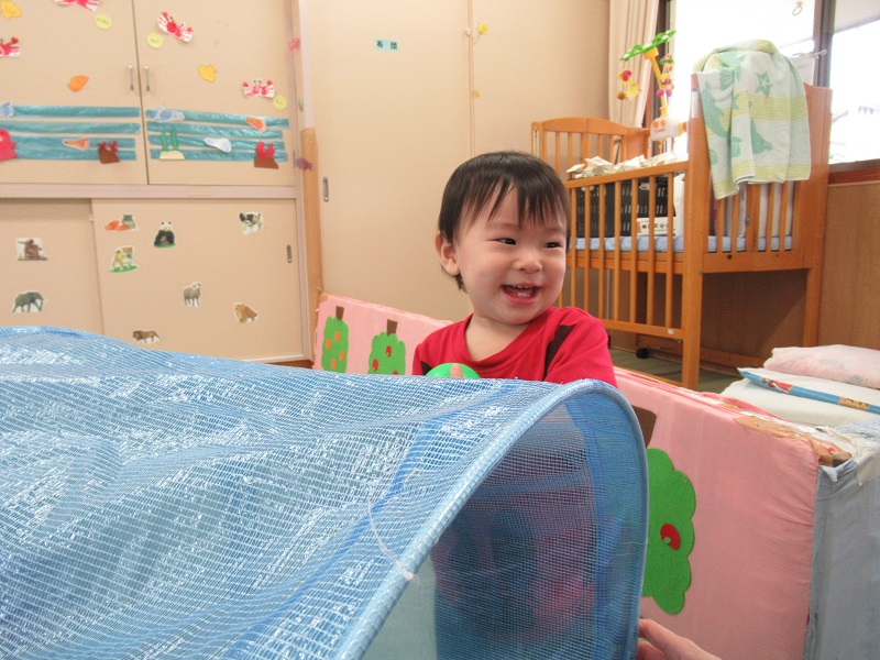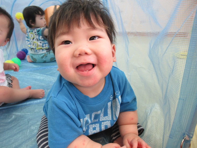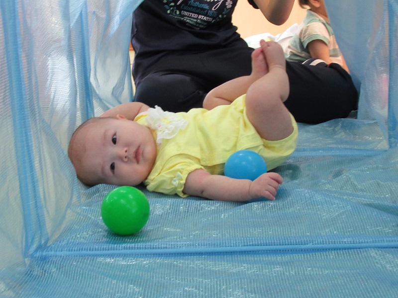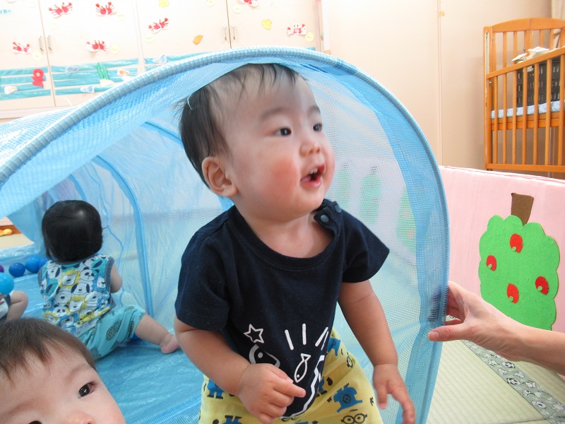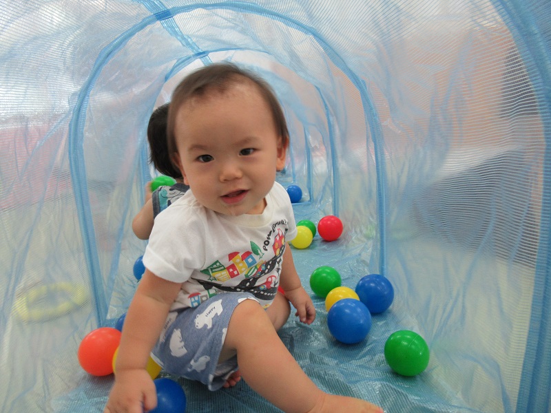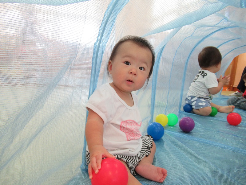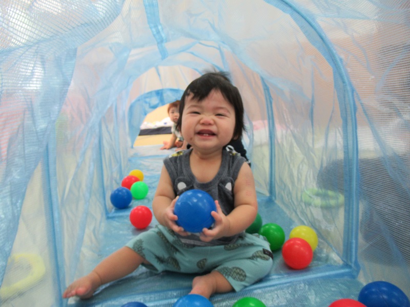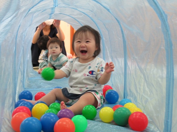 2020年09月03日 まるで別世界!トンネルで遊びました♪トンネルの中は、ボールがたくさんあって別の世界に来たみたい!楽しくてこんなに笑顔です♡ハイハイで上手に進み、お名前を呼ぶと振り返ってくれましたよ☆まだトンネルの中に入るのは怖いみたいでお外からみんなの様子を見守ったり、トンネルの入り口が好きな子もいました✨トンネルの中で立ってみると「頭がついちゃった!」「僕は上からみんなを見てるよ!」今日もみんなで仲良く遊びました■また遊ぼうね。