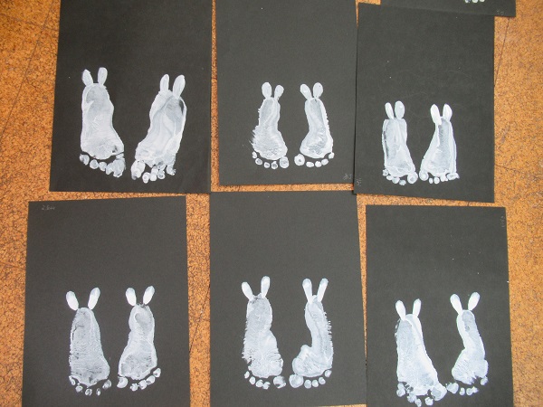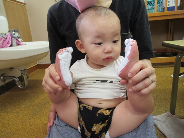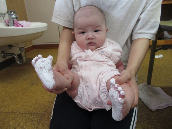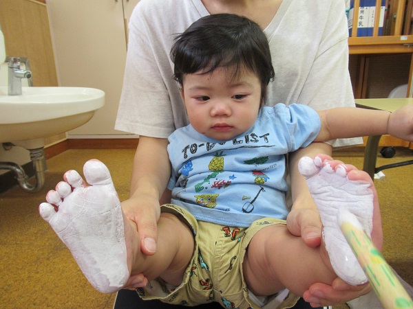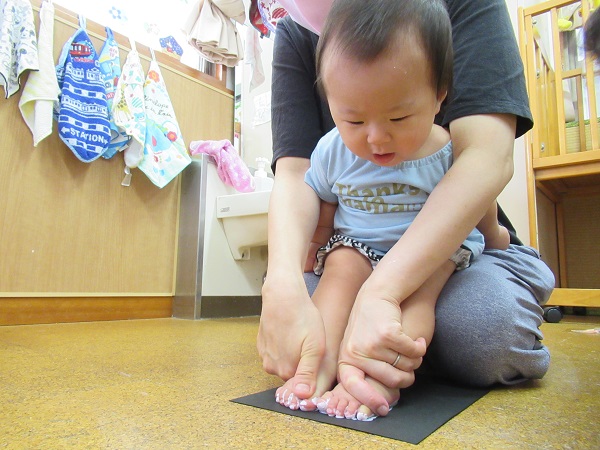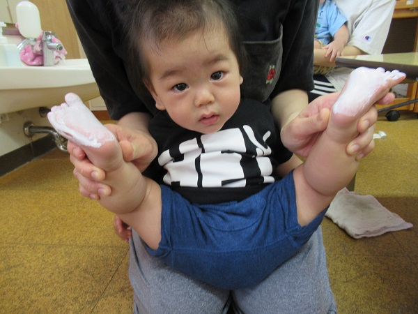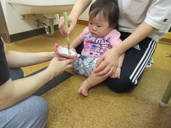 2020年09月15日 くすぐったいなー!お月見製作の足型をとりました■筆でこちょこちょこちょ...足の裏に絵の具を塗られてもこの笑顔♡すっかりと慣れた様子のいちご組さんです■「くすぐったいな~■☺」あっという間に足の裏が真っ白に♡じー・・・。ペタッ!!耳を描いたらウサギさんに変身しました■✨形や大きさが一人ひとり違った可愛い足型がとれましたよ✨