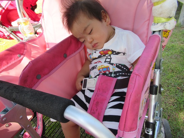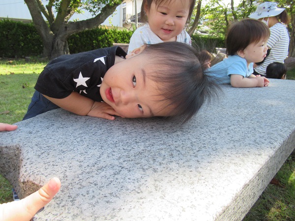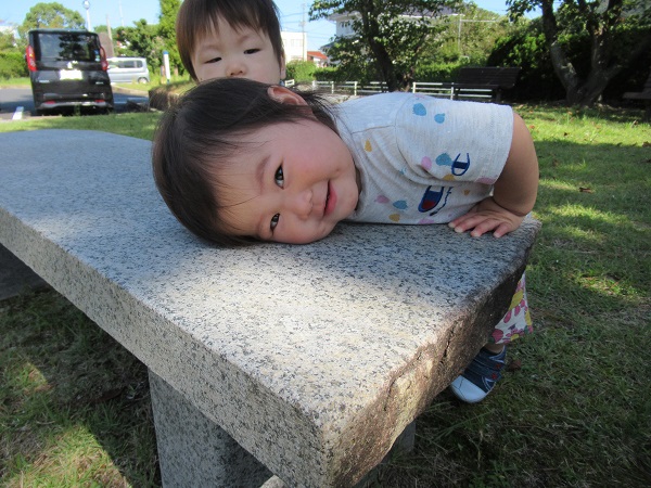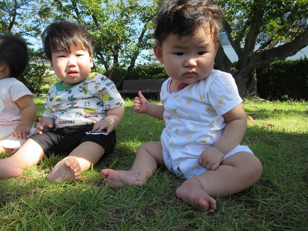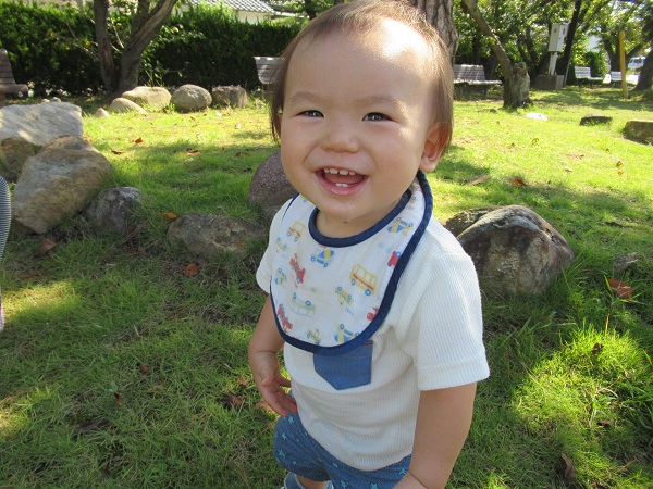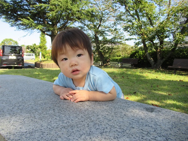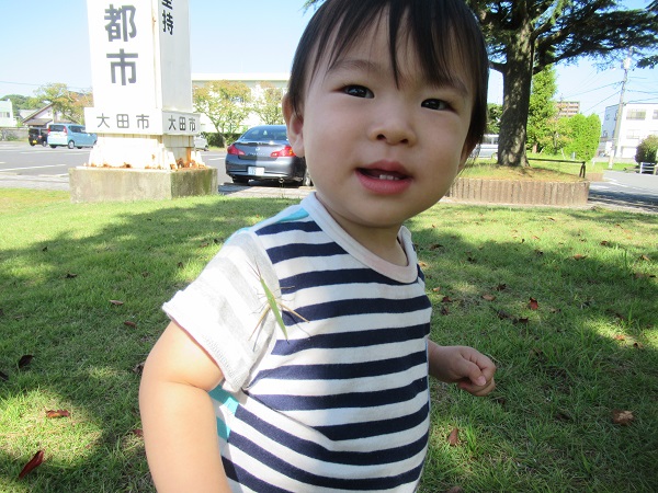 トコトコ歩いているとバッタが飛んできて肩にチョコン!