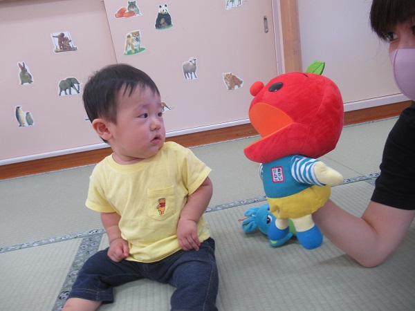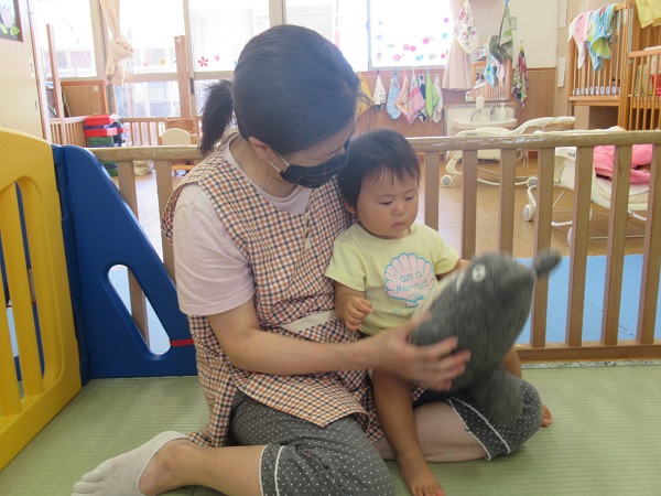 保育者の膝の上に大好きなぬいぐるみを持って座ります。