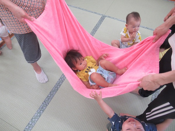 大きなタオルが一枚あれば、簡単に出来るタオル遊びの一つです。お家でもやってみてくださいね☆