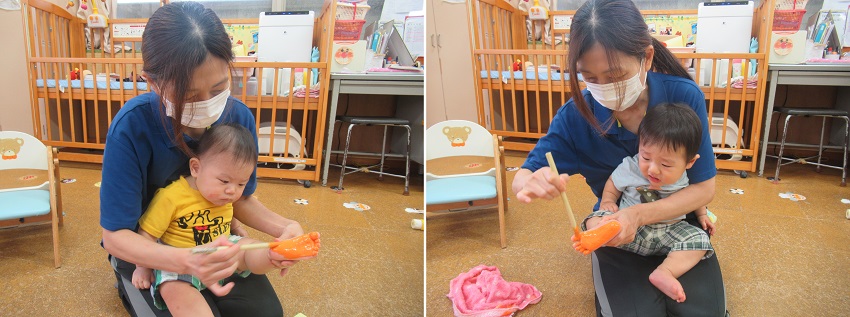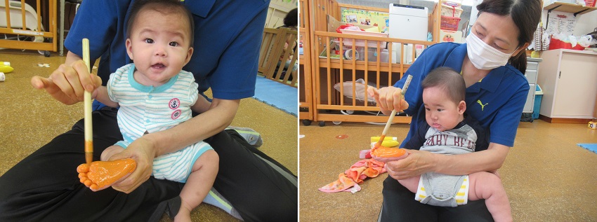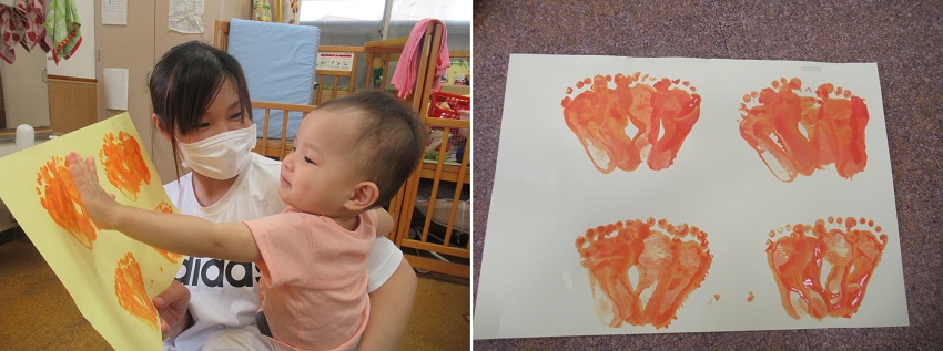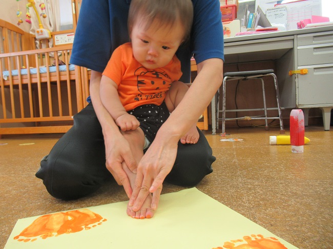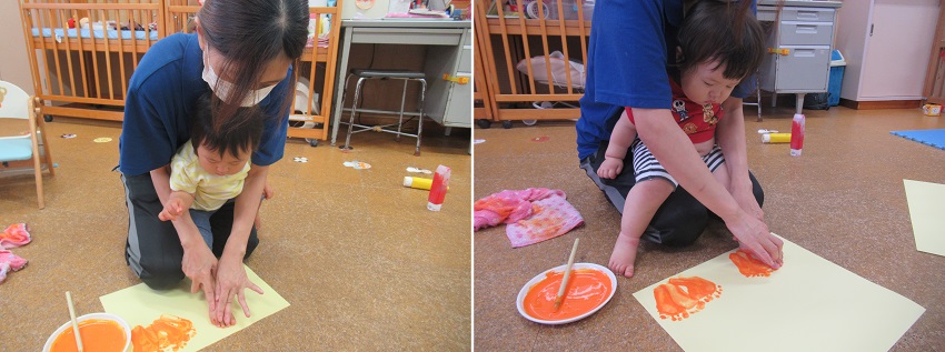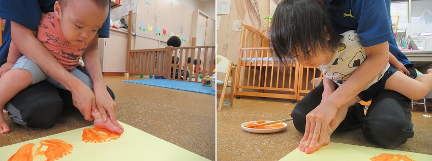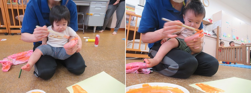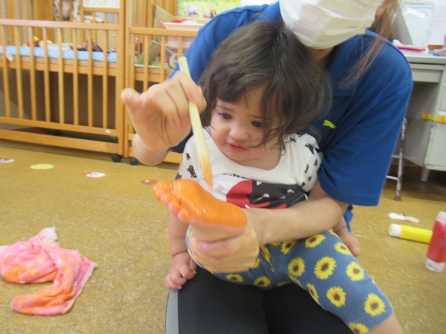 2021年10月12日 ぬりぬり、ペタッ!今日は製作。足■の裏に絵の具をぬりぬり!ちょっと感触が苦手なお友だちも。小さいお友だちもぬりぬりしましたよ。ぬりぬりした後はペタッ!出来上がった物を見て喜ぶお友だち!何が出来るかお楽しみに♪