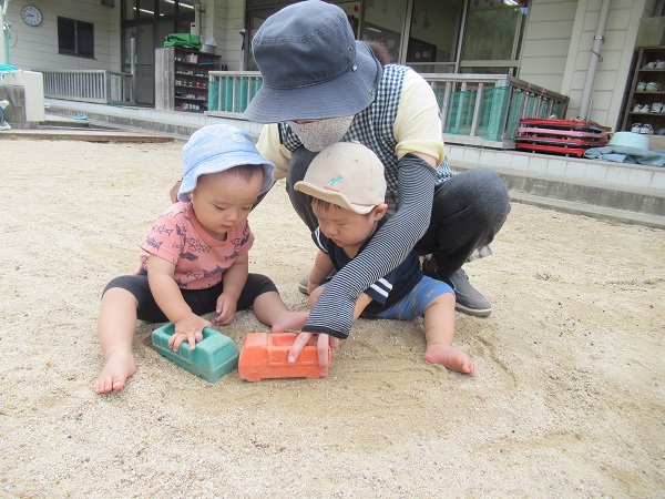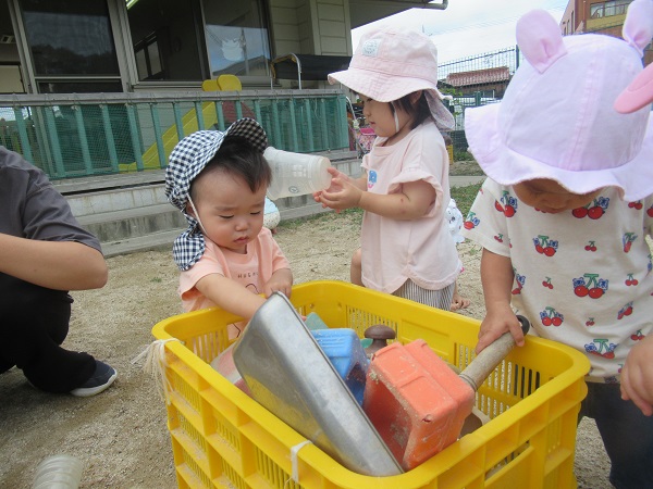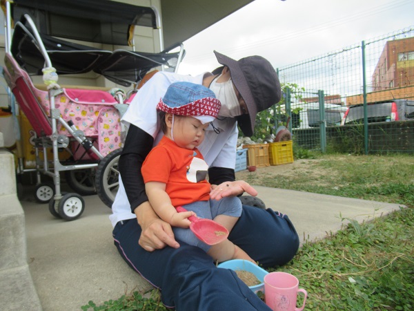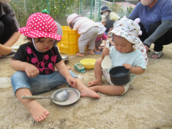 2021年10月13日 園庭あそび☆園庭に出て遊びました。自分の好きな玩具を選びます。大きなお皿にしよう♪お友だちと保育者と車の玩具を走らせます■こちらではダンゴムシの観察中■お友だちとクッキング!「先生、どうぞ♡」涼しくなり、過ごしやすくなってきましたが、水分をしっかり摂りながら元気に過ごそうと思います☺