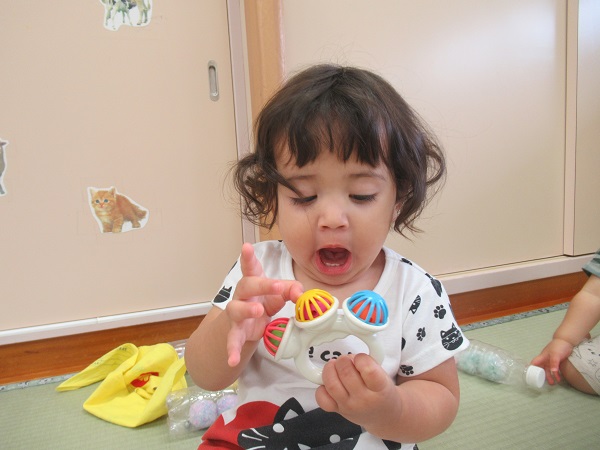 「おもちゃのチャチャチャ」の歌に合わせて鈴を揺らすお友だちがいましたよ♪