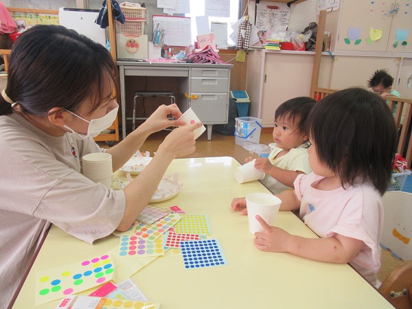 保育者がシールの取り方や貼り方の説明すると、とても真剣に聞いてくれたいちご組さん!