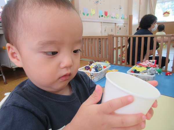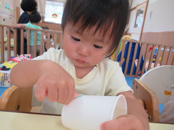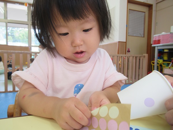 上手に貼れたかな?と紙コップを確認するお友だちがいましたよ!!