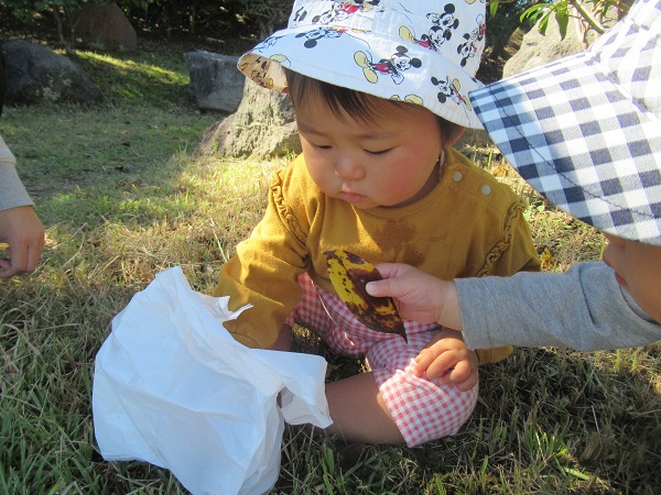椿の殻や種など地面に落ちており、たくさん見つけるいちご組さん♪
