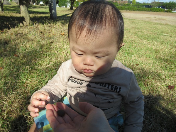 小さいお友だちに椿の種をどうぞ!すると、なんだろうこれ?と不思議そうに見つめていましたよ■