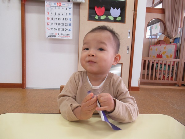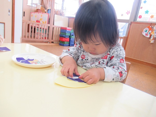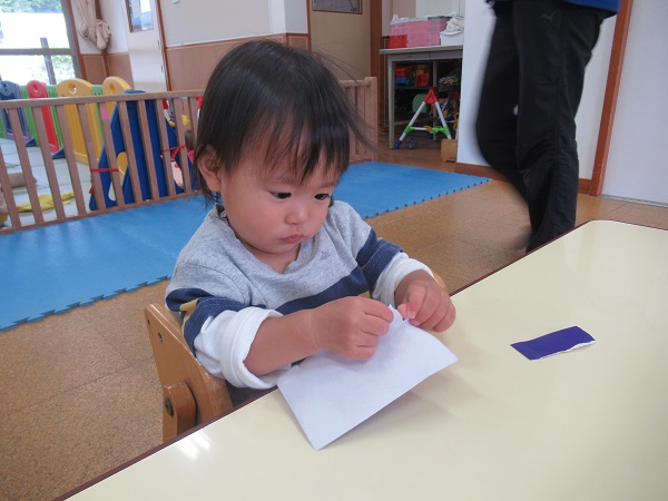 月齢が大きいお友だちは、折り紙をビリビリと破ります。ビリビリと紙を破ることで指先の力を使うので指先を鍛えることが出来ますよ。