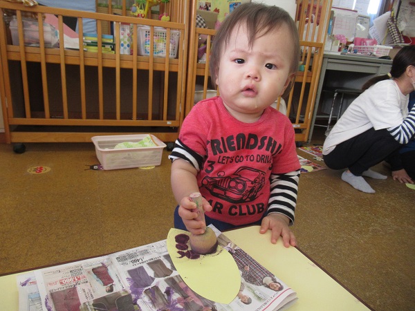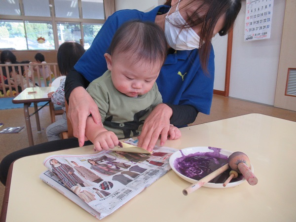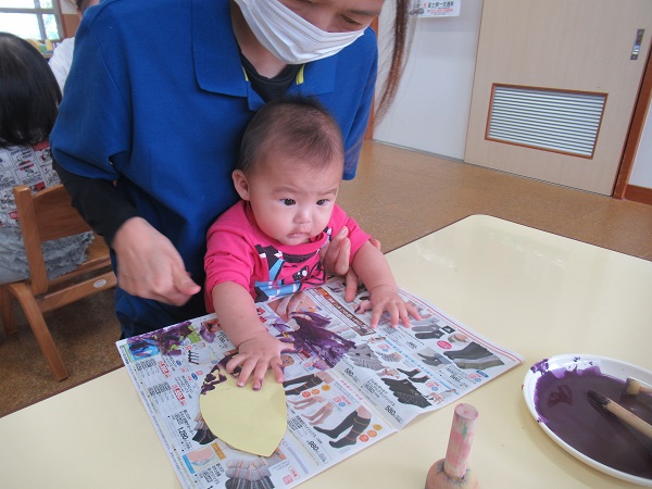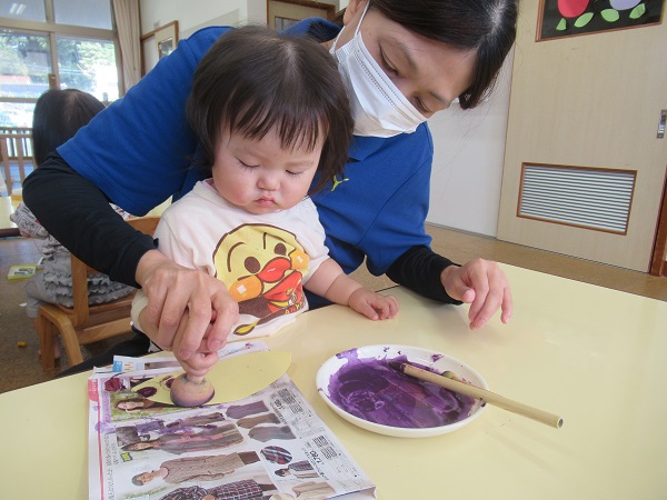 月齢の小さいお友だちはタンポと手で色を付けていきました。