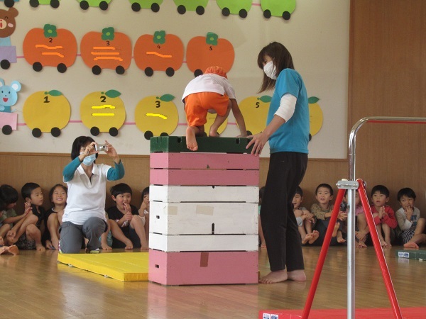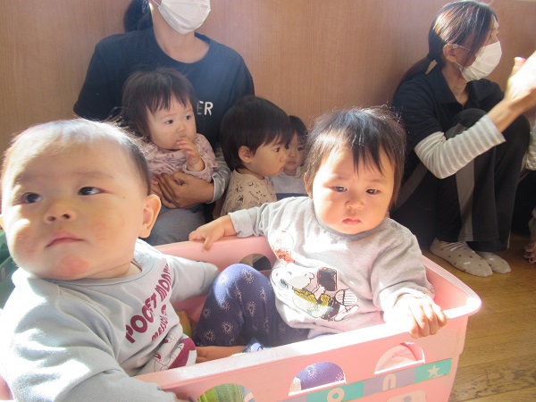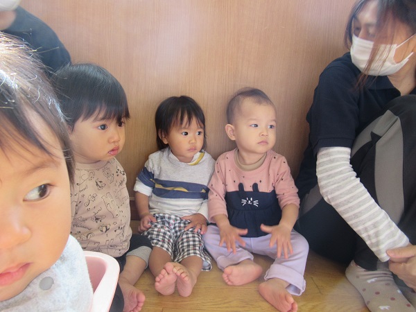 2021年10月20日 応援してきたよ!今日はばす組さんの運動会ごっこの応援に行ってきました。ばす組さんの頑張る姿に、注目して応援するいちご組さんです。「がんばれ~!」と手をたたいて応援しています。小さいお友だちもラックに座って応援です。ばす組さんのかっこいい姿にすっかり魅了されるみんなでした。楽しかったね♪