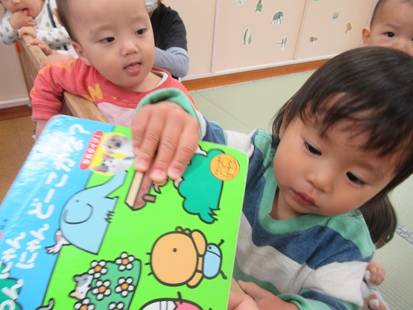 それまで出していた絵本を片づけます。すっかり板について、「はい、どうぞ」と進んで持ってきてくれるいちご組さんです。