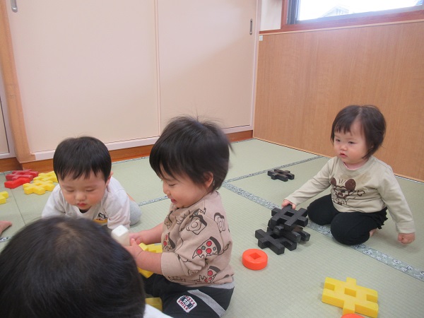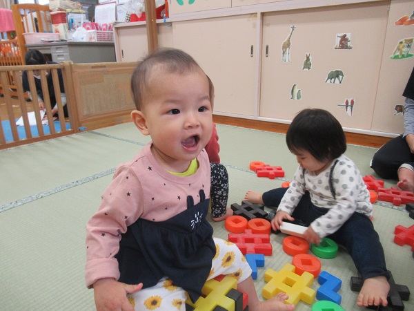 お友だちとの関わりも増えてきています。「どうぞ!」とブロックを渡したり、同じブロックを見て何やらお話をしたりしていました。