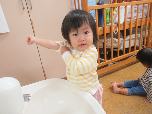 最近のいちご組さんは手を洗う順番をアンパンマンのキャラクターの上に座って待っています。