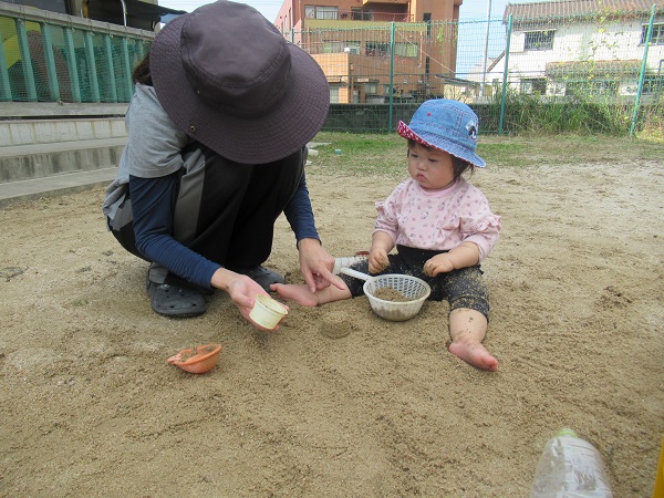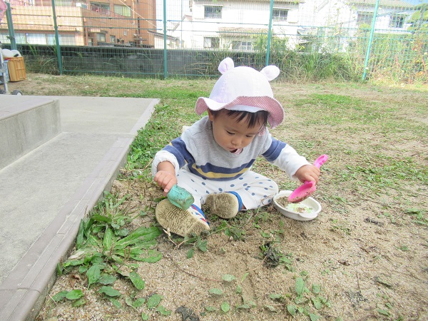 乳児園庭では保育者と一緒に、ごちそう作り♪