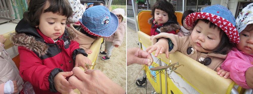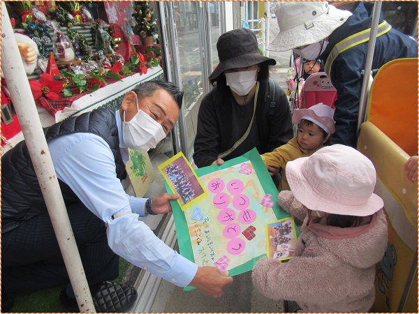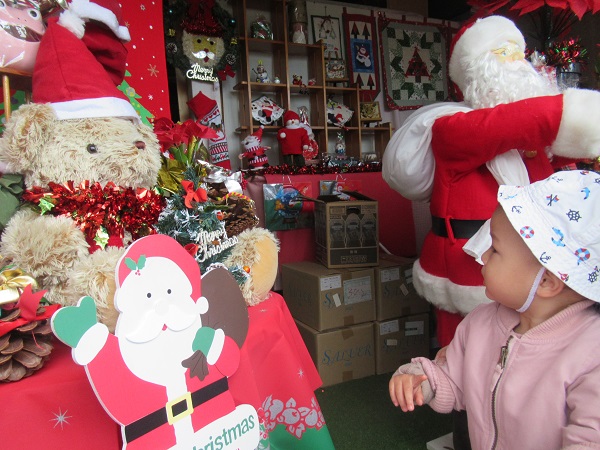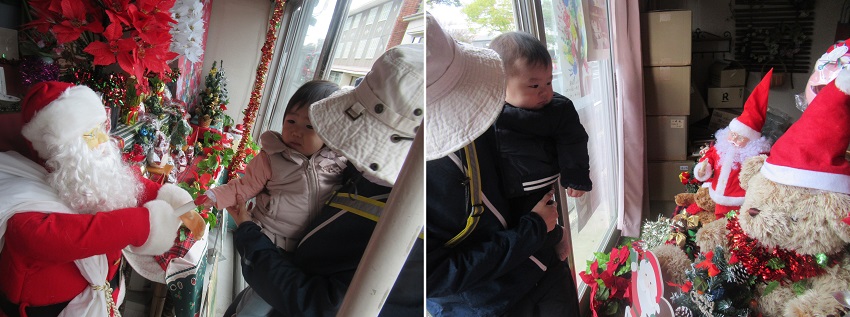 お店の中はクリスマス模様に。近くで見せてもらいましたよ。保育者に抱っこされて不思議そうに見るお友だち。