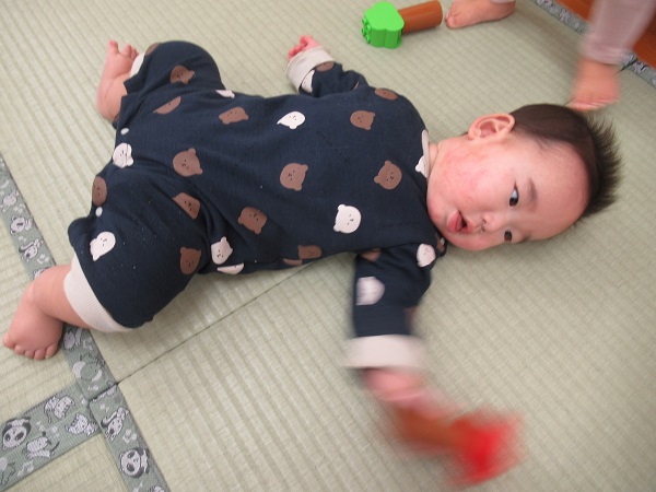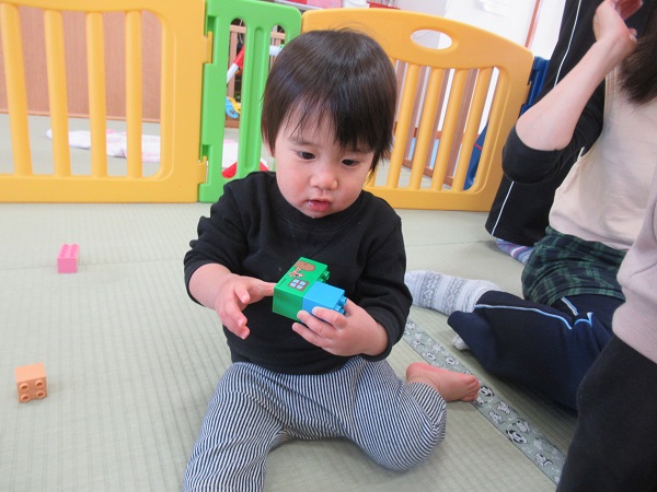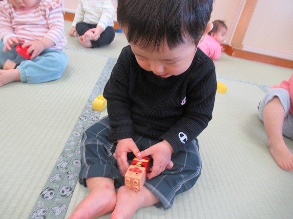 お部屋ではアンパンマンブロック遊び。小さい子も手で持って振って遊びます。
