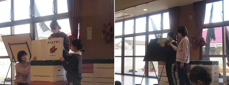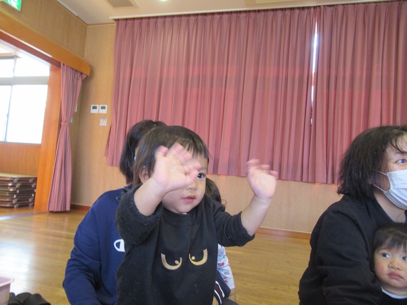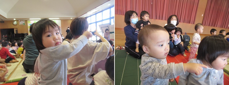 大型絵本で動物さんが出てくると、立ち上がって「あ!あ!」と大興奮のいちご組さんでした■