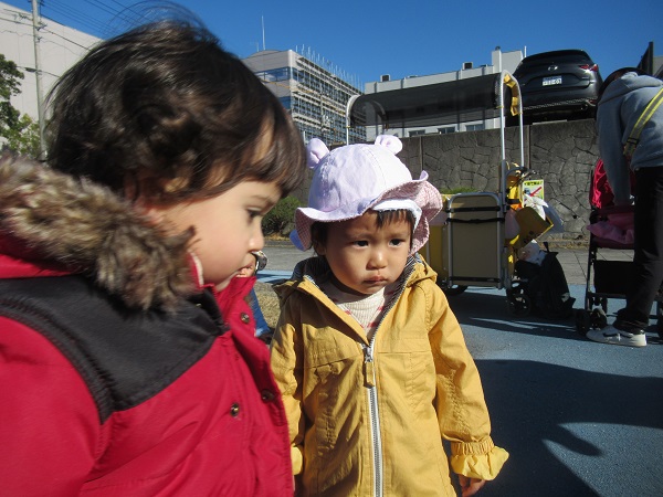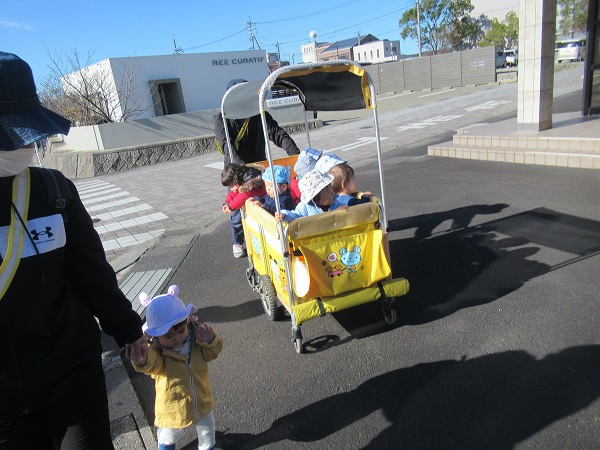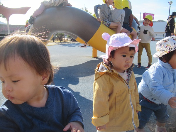 今週は雪の予報も出る中、貴重な晴れ間を狙ってあすてらす公園までお散歩に出かけましたよ。片道約300mの道のりを歩けるお友だちは保育者と手を繋いで行きました。あすてらす公園に到着。ろけっと組さんも後から来て、にぎやかになりました。