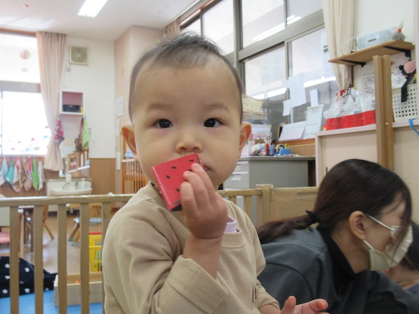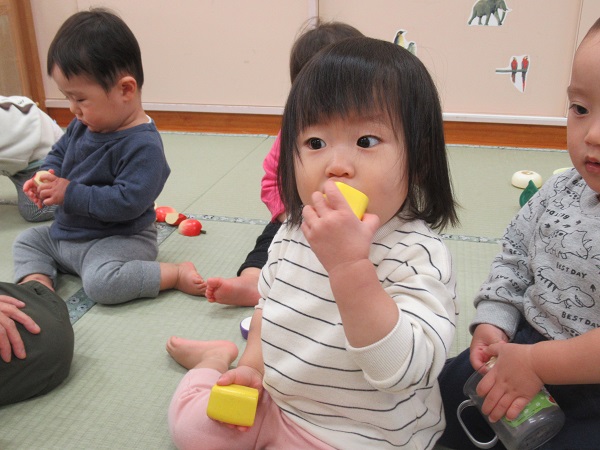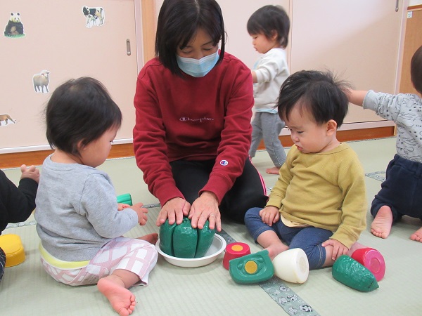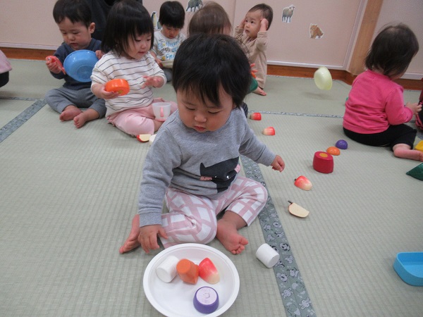 色々な食材の名前を保育者が言い、それを真似て言うことで発話が出来るように促しています。身近にある「りんご」や「みかん」などの食材が言えるようになっていけたらいいなと思います■