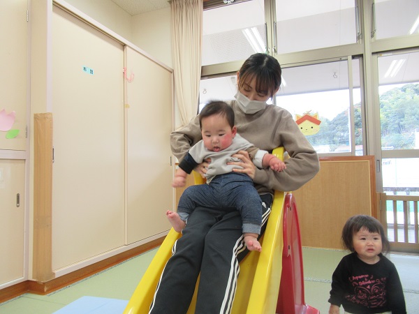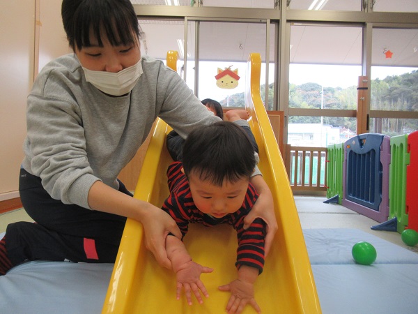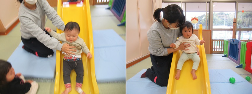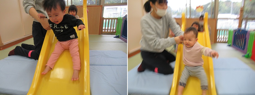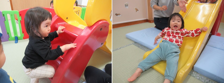 滑り台で遊びました。階段を上手に登ってシューッ!