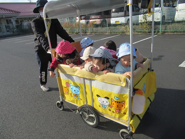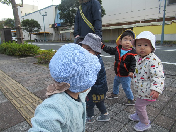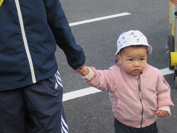 晴れ渡った空の下を保育者と手を繋いで歩きます。最近は園から目的地までしっかり歩くことが出来るようになってきました。