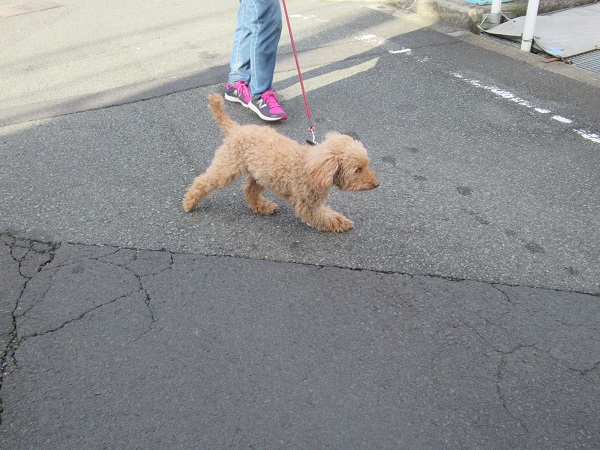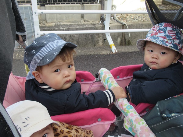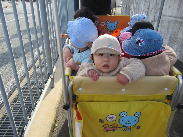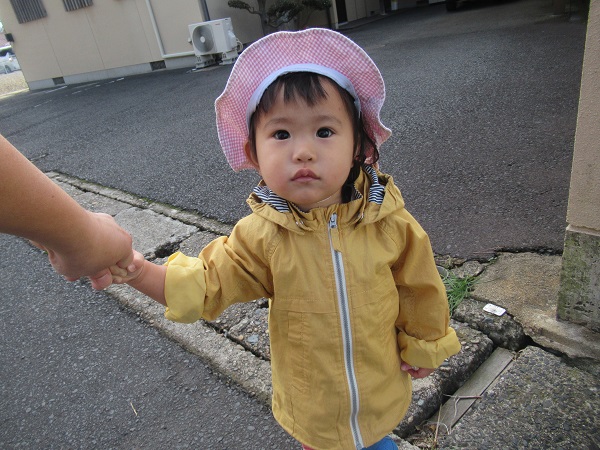 消防署までは400m程度。歩きながら、あるいは散歩車から景色を眺めて歩きます。途中で犬さんが通りかかりました。「わんわん」と声を掛けるお友だちもいました。