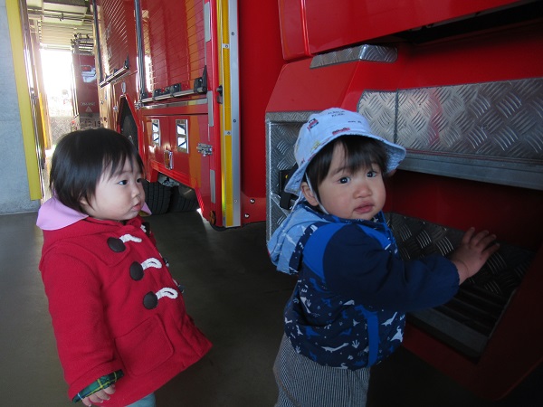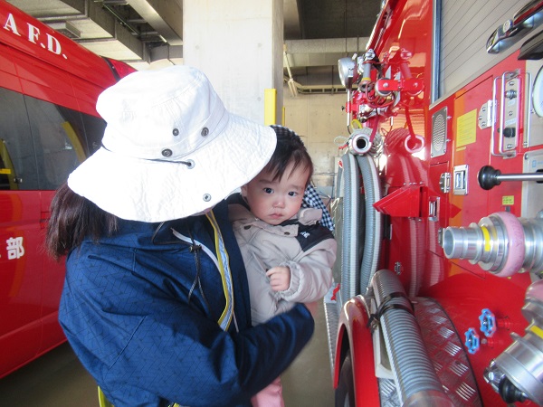 消防署に着くと、署員さんが消防車や救急車を見せてくれました。興味津々です!