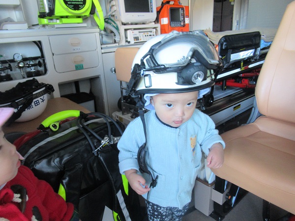 救急車の中に乗せてもらい、ヘルメットをかぶせてもらいました。気分はすっかり救命士さん!