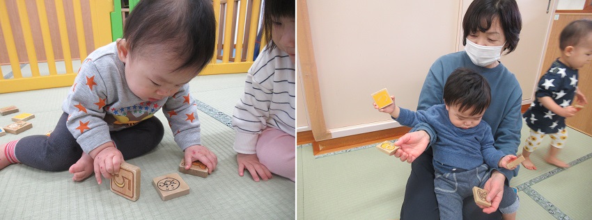 アンパンマンの絵を見つけ「あんぱんまん」と言ったり、カエルの絵を「ぐわっぐわっ」と言ったり、言葉も出ていましたよ。