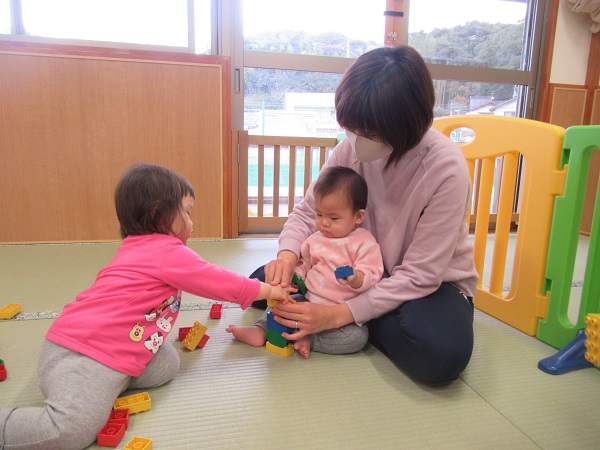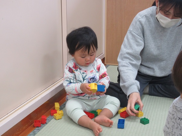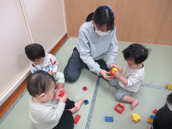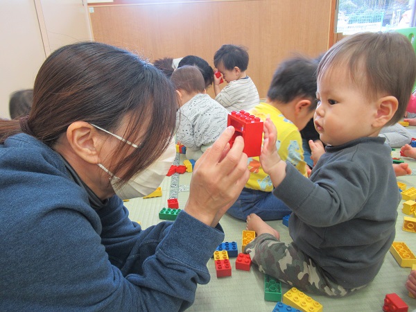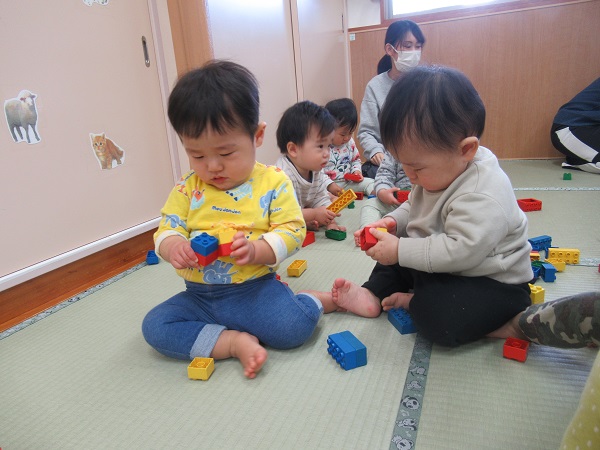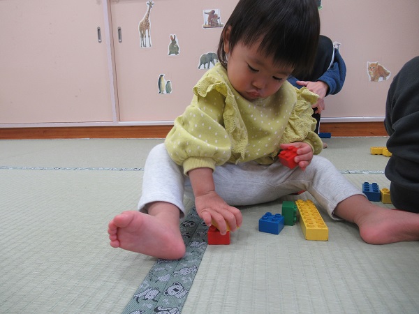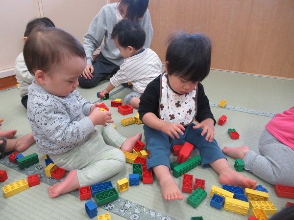 2021年12月13日 初めての☆いちご組の部屋で初めてレゴブロックを出して遊びました。目新しい玩具に興味津々の子どもたち■保育者や友だちとブロックを積み上げていきます。慎重にそーっと!出来た!ブロックの穴から「ばあっ」保育者とブロックで車やトンネル、お家を作って楽しむことが出来ました。保育者が何かを作って、それを見て遊ぶことで想像力(創造力)を育てていけたらいいなと思います。