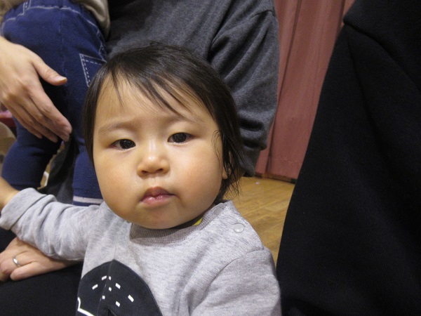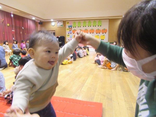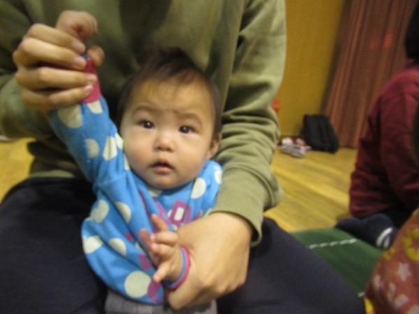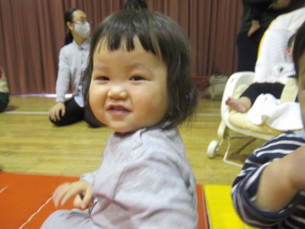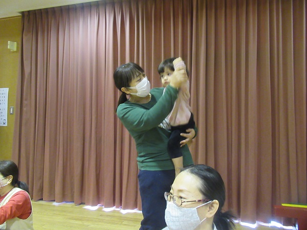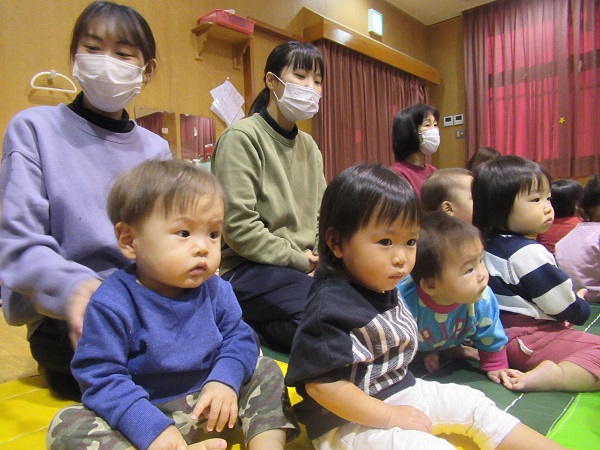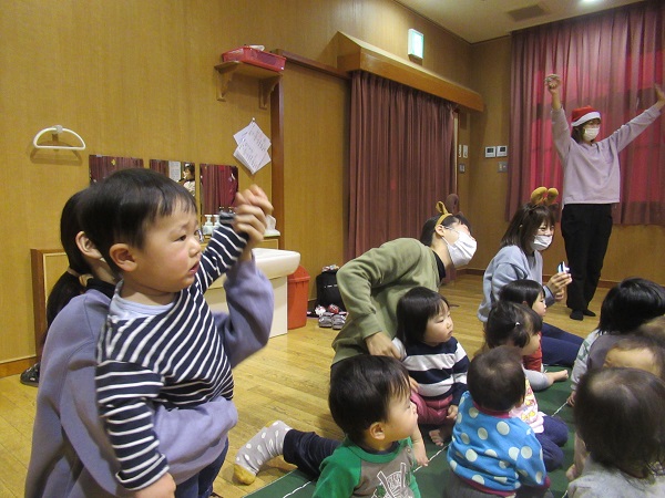 今月の歌「北風小僧の寒太郎」「ジングルベル」をみんなで歌いました。手を叩いて、体を揺らしてリズムをとります。