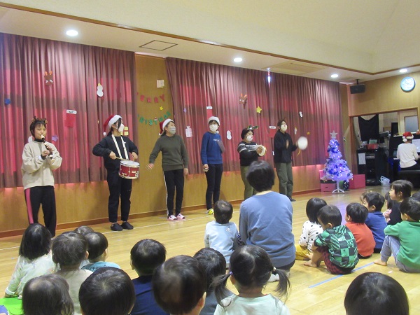 みんなでお祝いした後は、お楽しみのクリスマス会です。ますは職員の出し物「聖者の行進」を笛や鈴を鳴らして歌います。