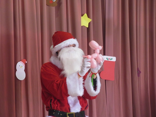 芸達者なサンタさん、バルーンアートでうさぎやお花を作ってプレゼントしてくれました。