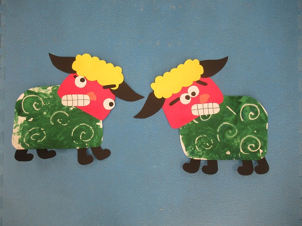 先日のローラーペインティングで作ったものと一緒にすると、素敵な獅子舞が出来ました。