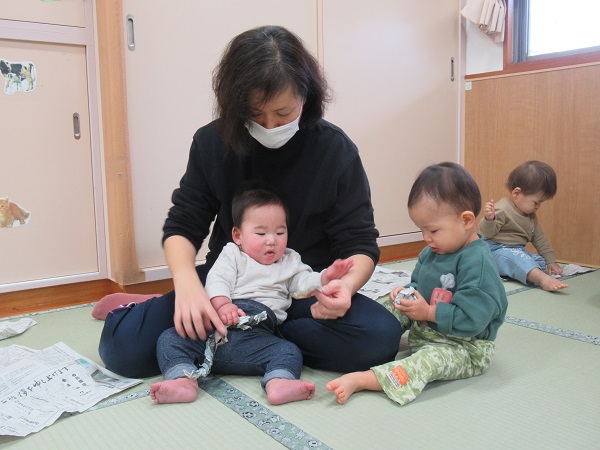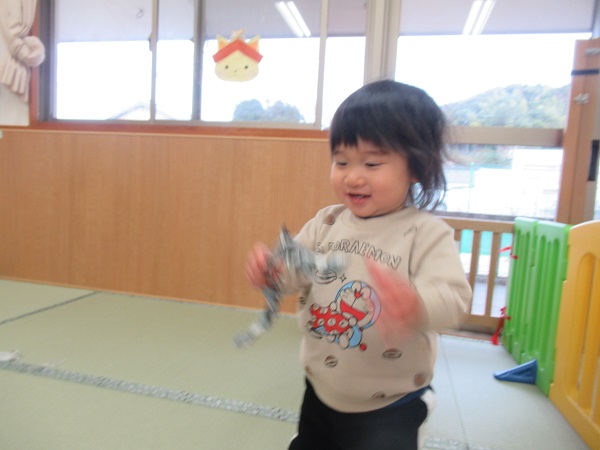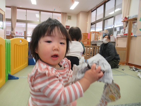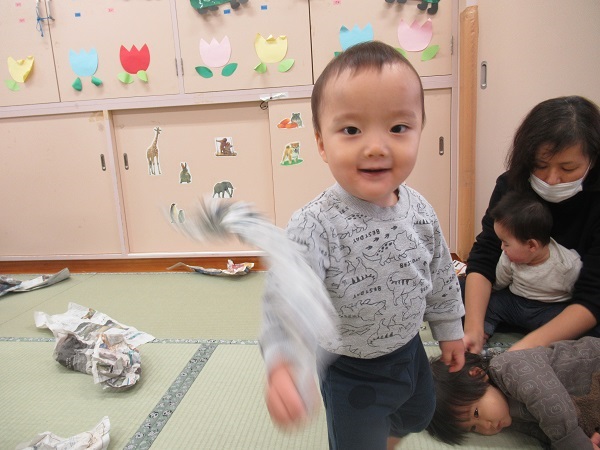 新聞紙を破る時になるビリビリという音や感触を楽しみました。破ったり丸めたりする時に指先などの力を使うので、遊びの中で指先の力を身に付けていけたらと思います。
