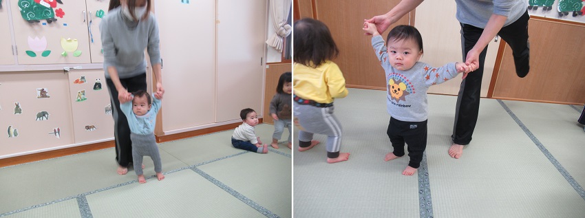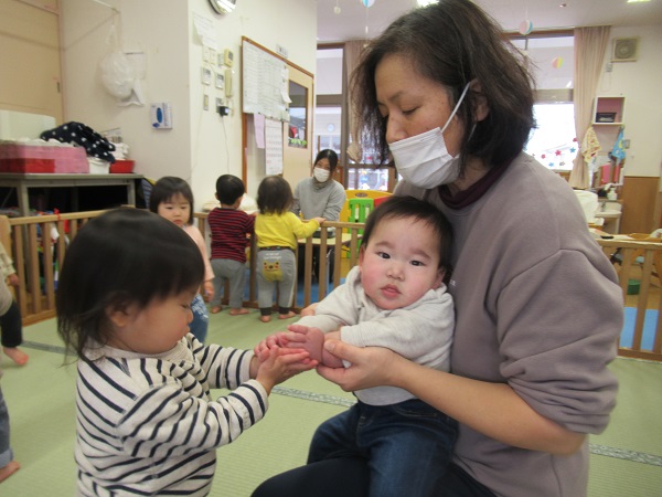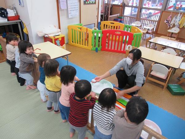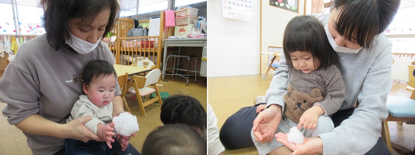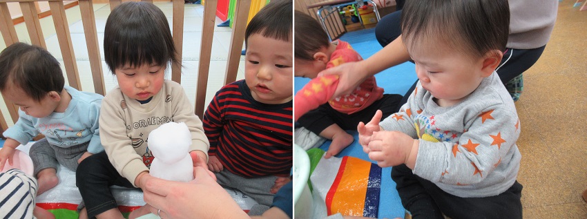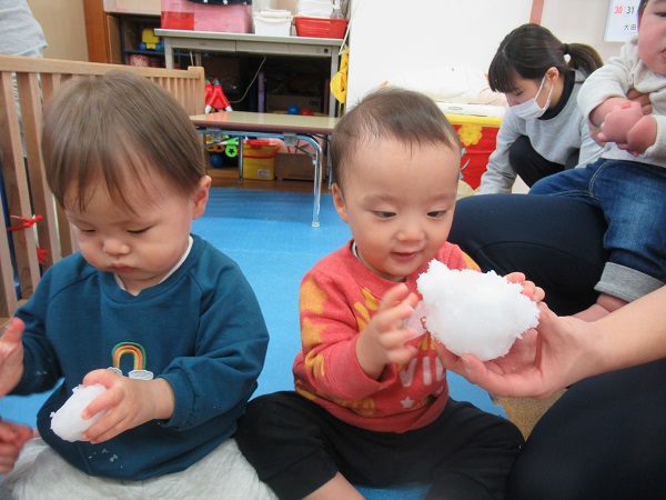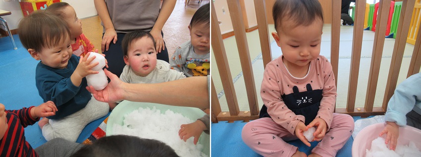朝から雪が降っていて、お外の雪が気になるいちご組さん。お部屋に持って入ると興味津々!