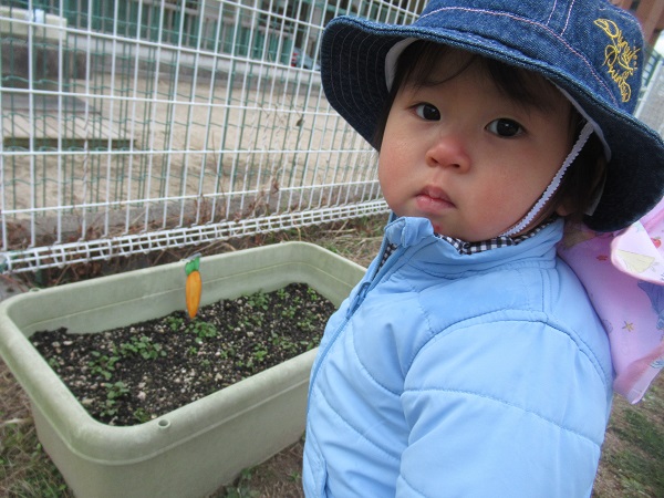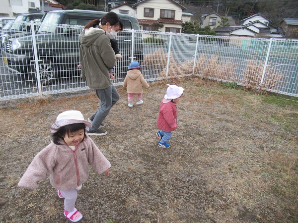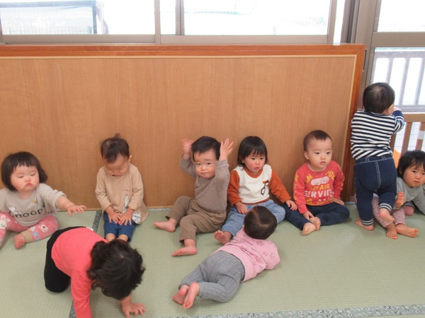 今日は日差しが少しありました。体調が良い子は、少しの時間新園庭で体を動かしました。準備している間、きちんと座って待てるようになりました。