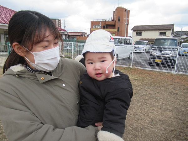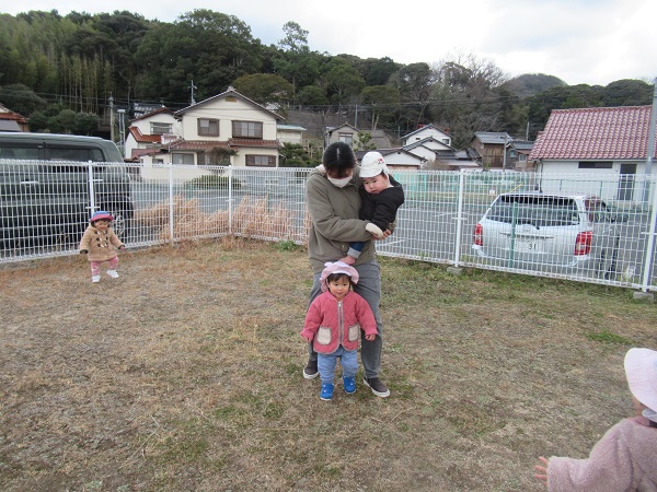 小さいお友だちは保育者の抱っこでお日様に当たりました。