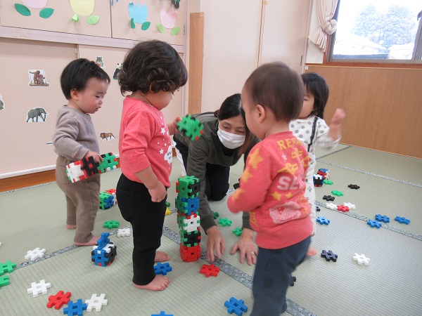 こちらは保育者と一緒に四角く組み立てたブロックを重ねてタワーを作っています。倒れないように慎重に、慎重に...