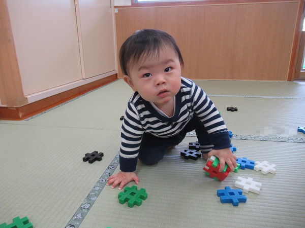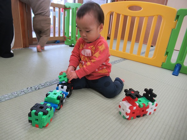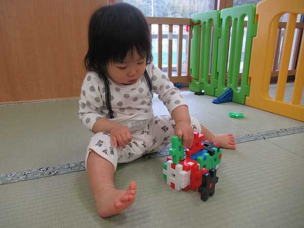 お部屋ではブロック遊びをしましたよ。小さいブロックでも上手に組み立てようとしています。