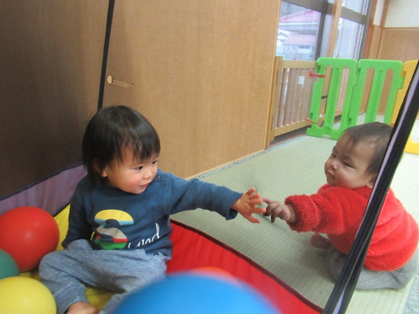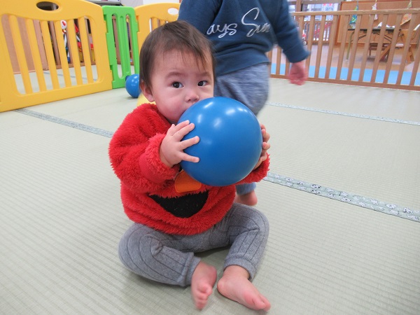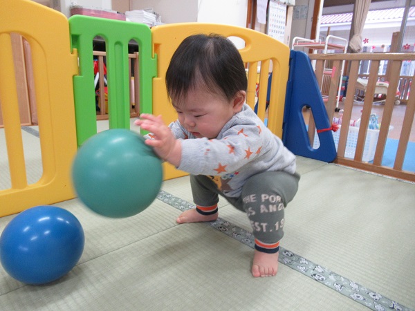 はボール遊び。ボールを手に取って感触を確かめたり...