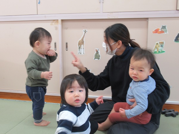 保育者が歌を歌うと、うれしそうに集まってきました。体をゆすってリズムをとって楽しんでいました。