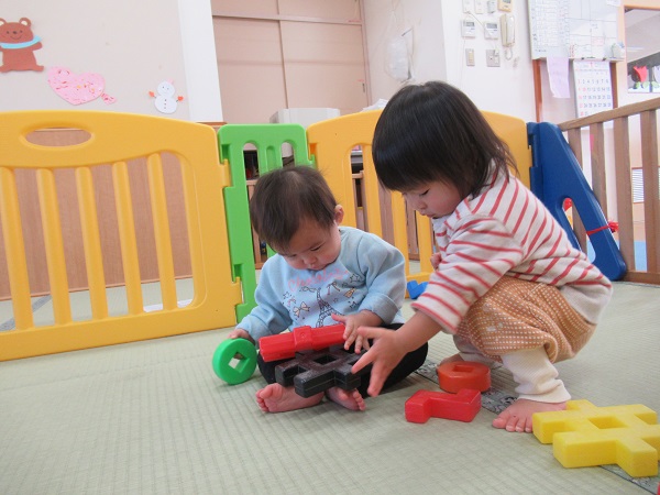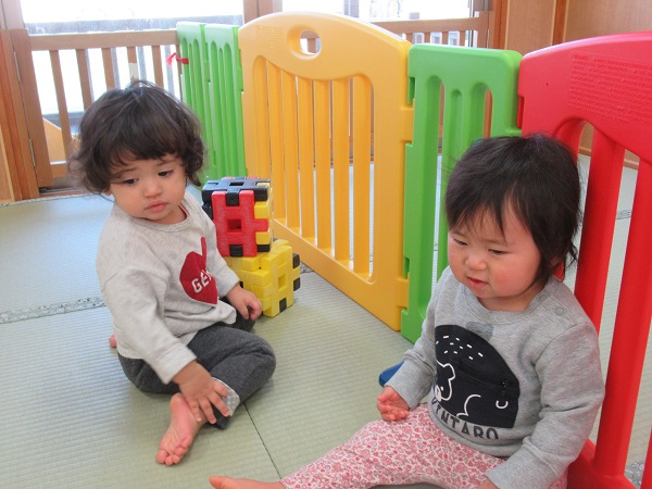 今日はお部屋でブロック遊びをしました。ブロックを出したらさっそく遊び始めましたよ!保育者が四角に作ったものを、バランス良く積み上げることが上手になってきました。
