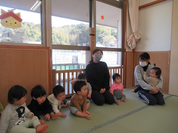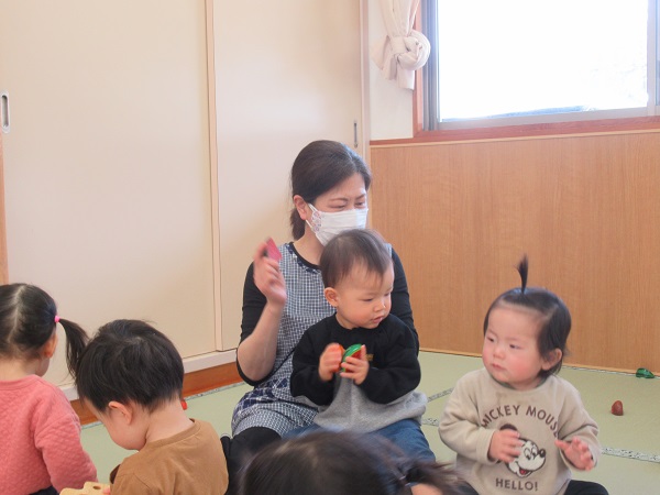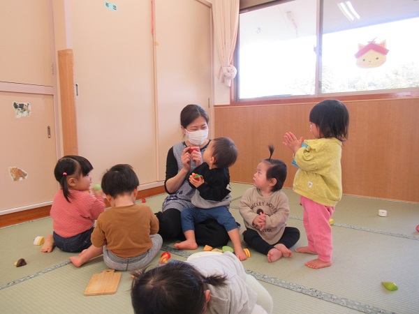 保育者が手遊びうたを歌い始めました。歌が大好きないちご組さん。集まって体を揺らしてリズムをとります♪